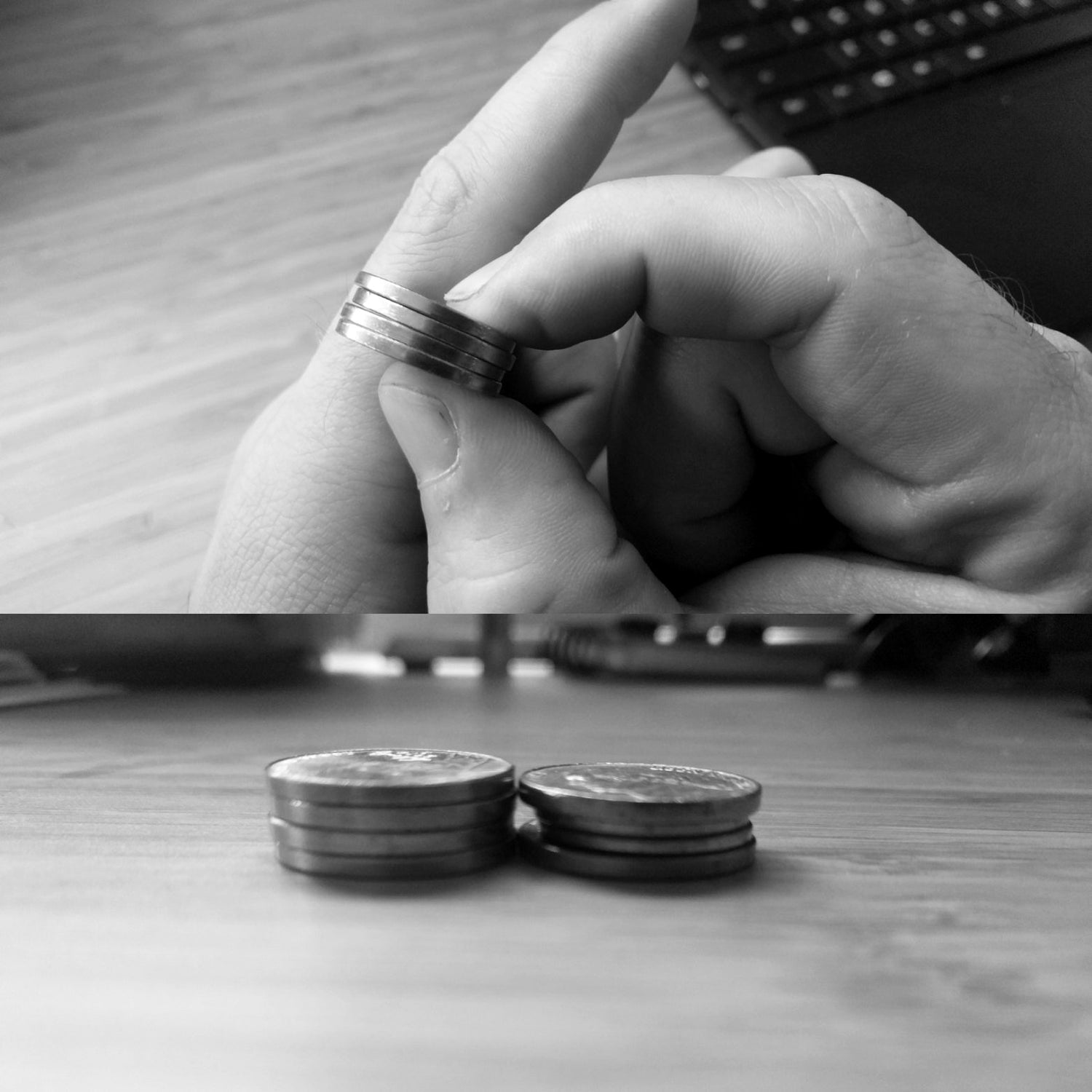 One good trick when selecting ring width is to make a stack of nickels. The edge of a nickel is 2mm. So you can stack 3 (6mm), 4 (8mm) or 5 (10mm) and then hold that stack up to your finger to visualize the width of your ring.